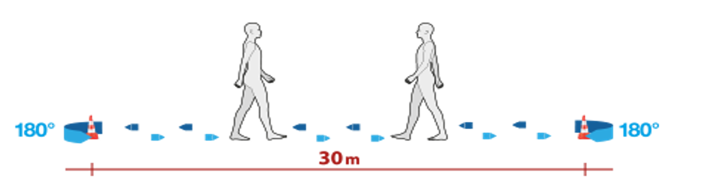 Submaximální výkon hodnotí šestiminutový test chůze, při kterém jedinec chodí po vyznačené trase mezi kužely vzdálenými od sebe minimálně 25 m, optimálně 30 m (obrázek 2). Cílem je ujít co největší vzdálenost (nesmí se běhat). Test byl původně vytvořen za účelem sledování efektu medikace u dospělých pacientů se středně těžkým až těžkým onemocněním srdce nebo plic („ATS Statement“, 2002). Instruktážní video je možné shlédnout na stránkách: https://www.usscicomms.com/respiratory/lancaster/6mwt/.