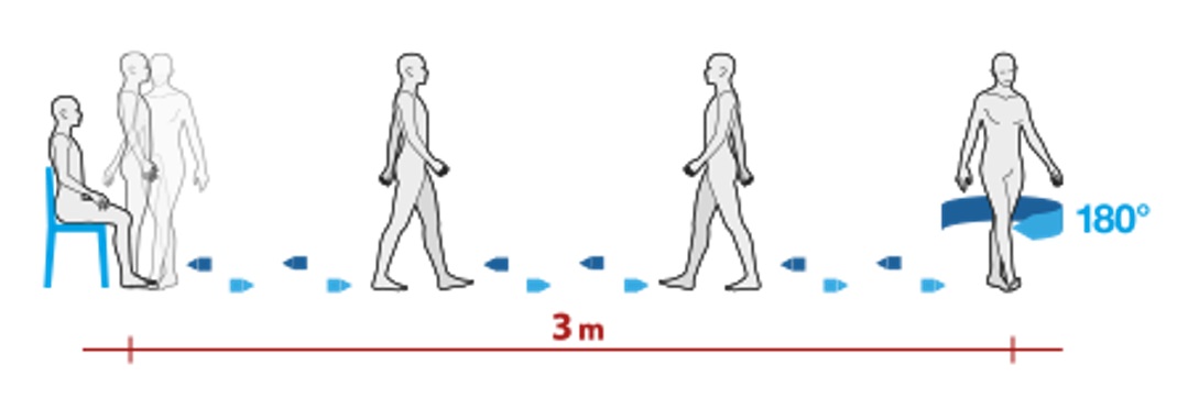 Testem TUG se měří čas, který pacient potřebuje pro postavení se ze židle, chůzi kolem kuželu a posazení se zpět na židli (Obrázek 4). Testem se hodnotí rovnováha, obratnost a slouží také k určení míry rizika pádu (Verbecque et al., 2019). Test provádíme 3x za sebou, a to v komfortním tempu a rychle (nesmí se běhat). Započítáváme nejlepší pokus. Zatím nejsou jednoznačně stanoveny parametry židle. Na našem pracovišti se přikláníme k používání židle s područkami, zásadní však je, aby se při opakovaném testování používal vždy stejný typ židle.