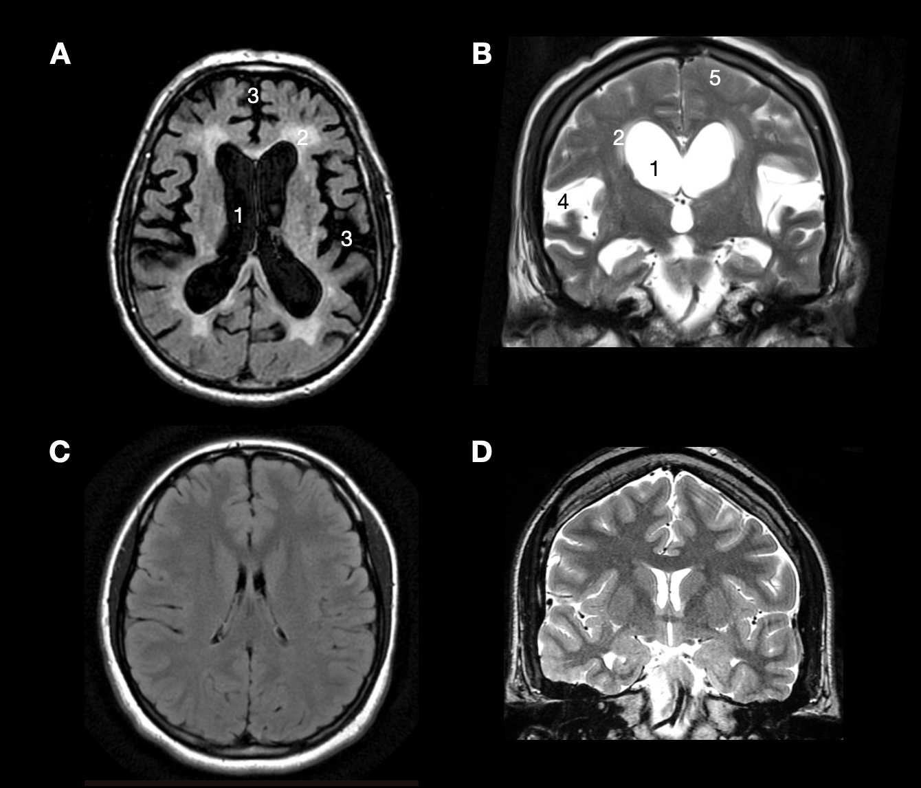 Obr. 1: Typický obraz iNPH (A,B) v porovnání se zdravým, středně dospělým člověkem (C,D) na magnetické rezonanci (MRI). Na horních dvou obrázcích jsou vidět charakteristické změny u pacientů s iNPH, které jsou zejména (1) výrazné rozšíření mozkových komor, tzv. ventrikulomegalie, (2) periventrikulární hypersignalita, která poukazuje na fenomén transependymálního přestupu, tedy stavu, kdy v důsledku zvýšenému tlaku v komorách přechází mok z komor do okolního parenchymu, ten je díky tomu „prosáknutý”. (3) Výrazná atrofie mozkové tkáně. (4,5) Rozšíření subarachnoidálního prostoru zejména v oblastech Sylviovy rýhy, naopak jeho zúžení na konvexitě včetně kompresí okolních mozkových drah. Zdroj: archiv autorky (pro zvětšení rozkliknout)