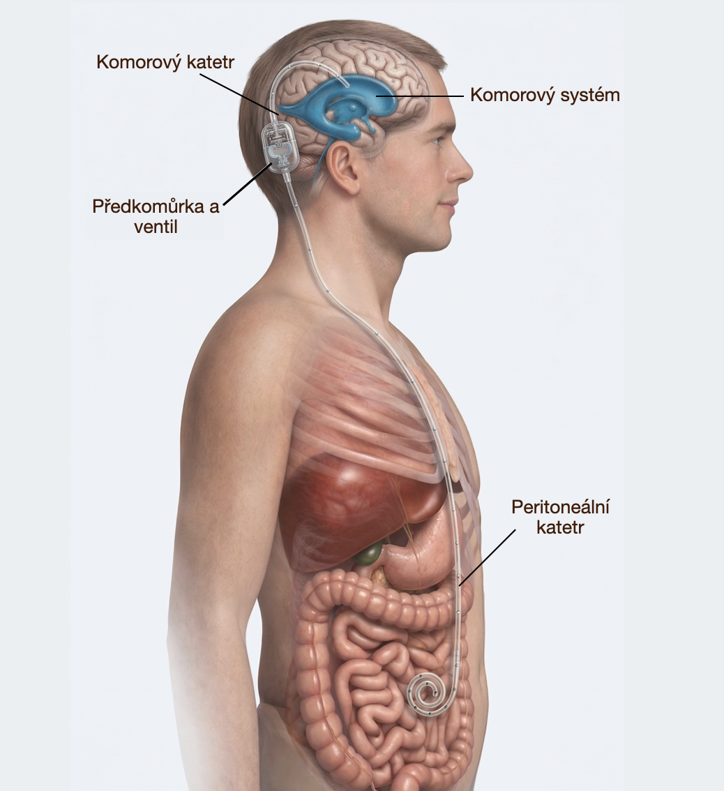 Pokud diagnostický proces ukáže, že se s vysokou pravděpodobností jedná o iNPH a pacient je vhodným kandidátem k léčbě, standardním terapeutickým postupem bývá shuntová, tedy zkratová operace (Obrázek 3). Jedná se o přibližně třicetiminutový výkon v celkové anestezii s minimálním rizikem chirurgických komplikací. Jejím principem je zavedení derivačního systému, který odvádí nadbytečný mozkomíšní mok z komorového systému do jiné tělní oblasti, nejčastěji do dutiny břišní, kde může být dále vstřebáván. Cílem výkonu je obnovit narušenou rovnováhu likvorové dynamiky a zmírnit funkční dopad onemocnění na mozek.1,11