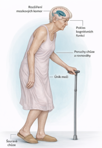 Obr. 2: Typická triáda symptomů iNPH: porucha chůze, kognitivní deficit a porucha inkontinence. Zdroj: archiv autorky (pro zvětšení rozkliknout)
